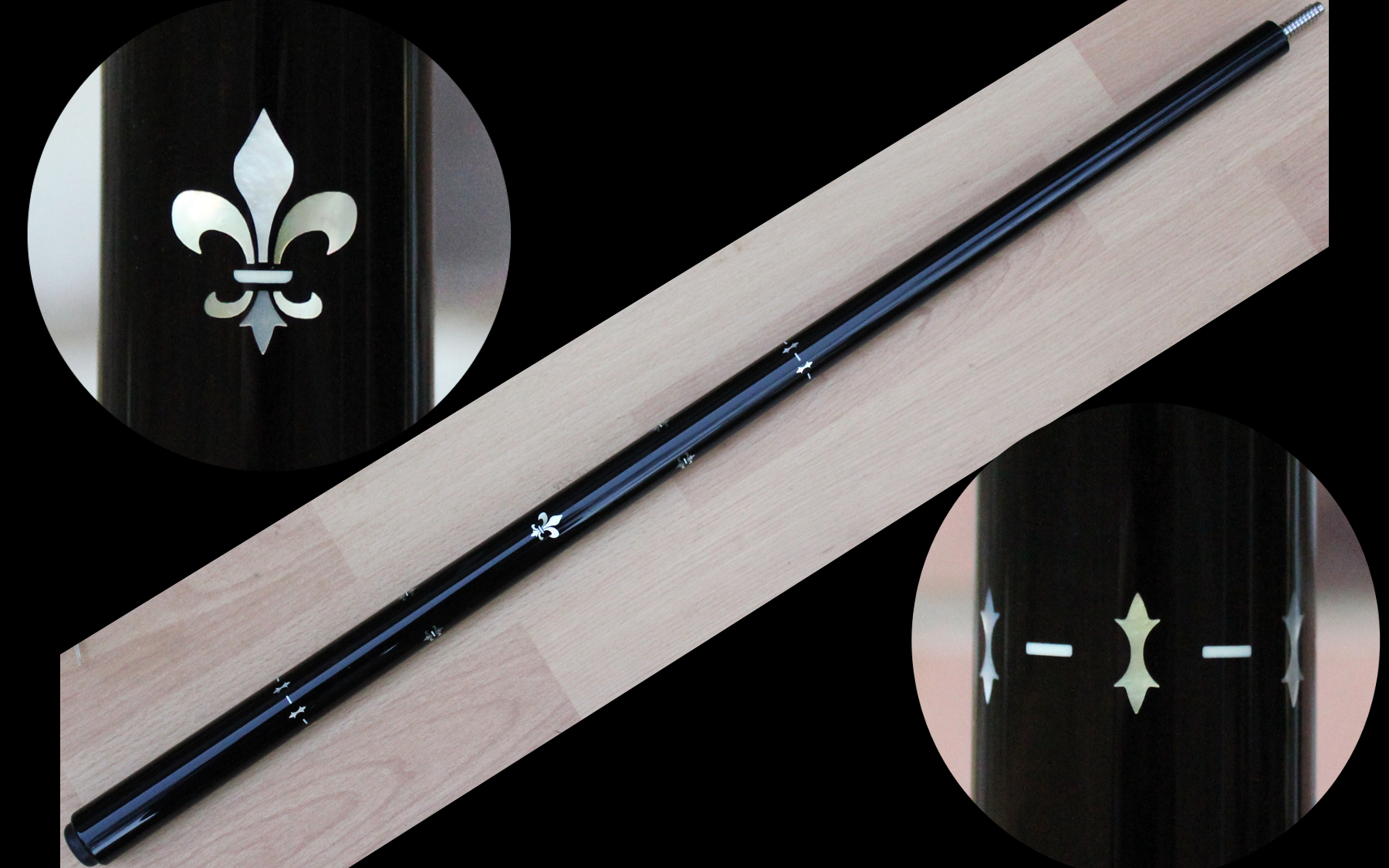 I got an order for a one piece all ebony cue with decorative inlays. I enjoyed it so much I have decided to build other all ebony one piece cues with various inlay designs. These are cored for weight and balance. Hover over a thumbnail to zoom in. Click a thumbnail to view the largest possible picture in a new window.