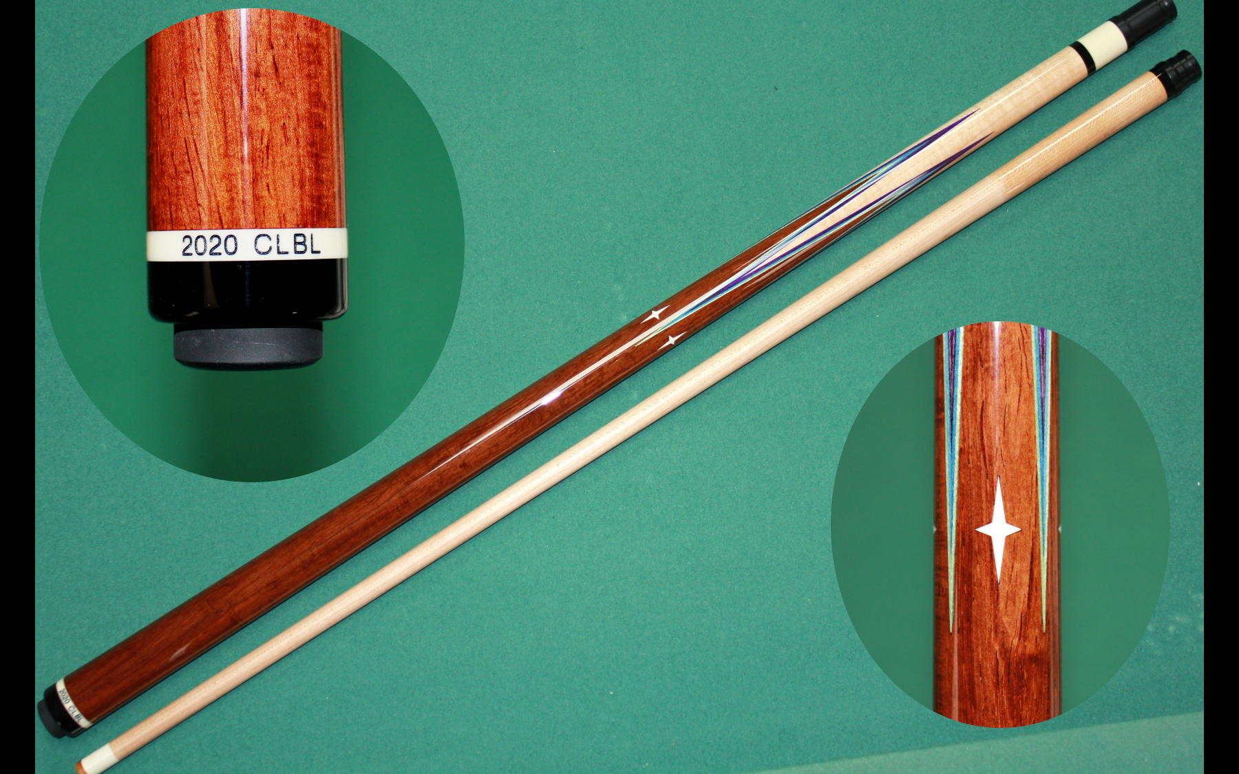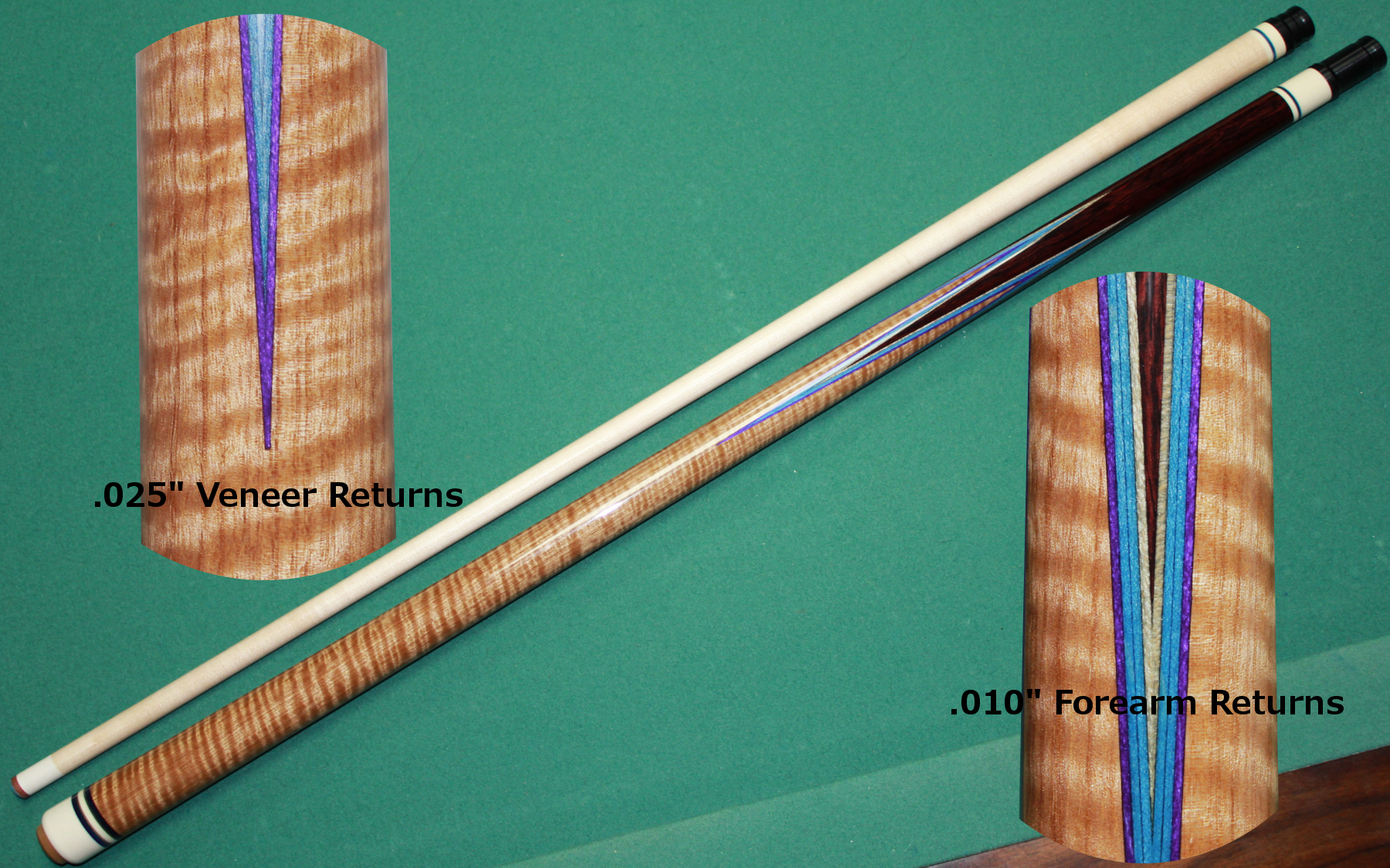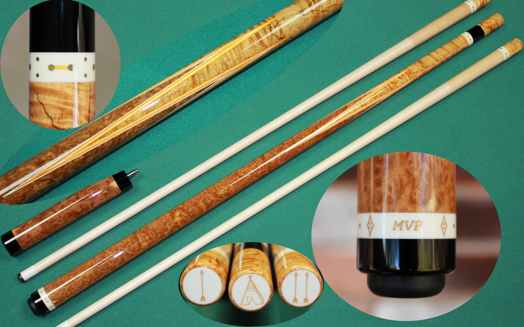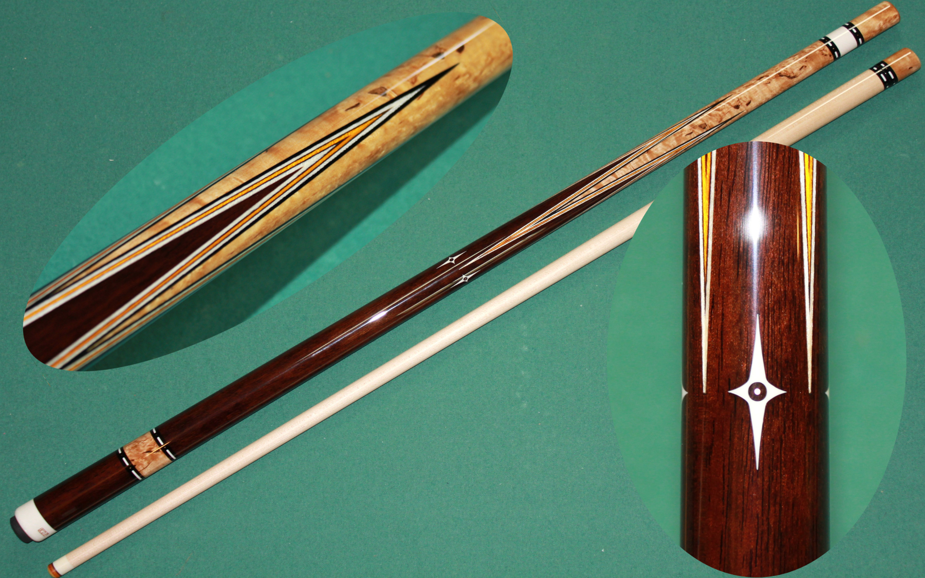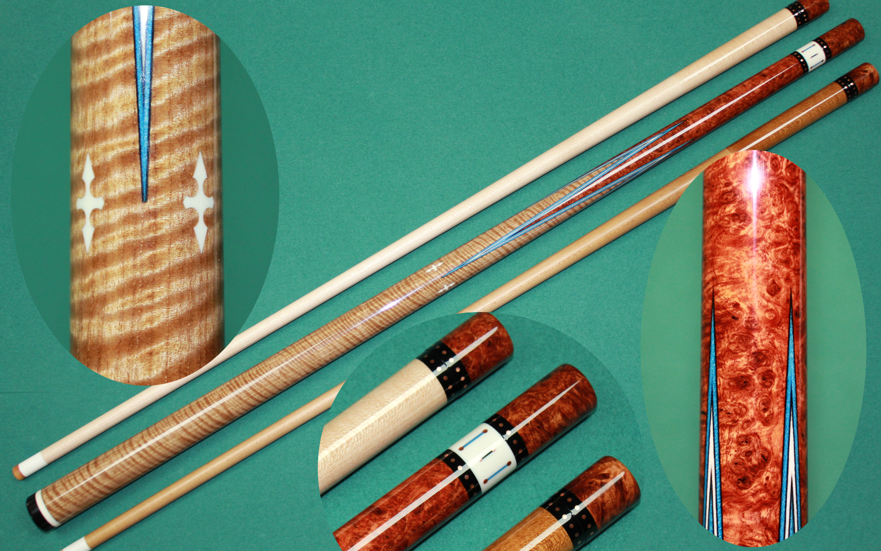 These are all full splice cues built from my own blanks. Hover over a thumbnail to zoom in. Click a thumbnail to view the largest possible picture in a new window. Feel free to email with any questions/comments about my cues.